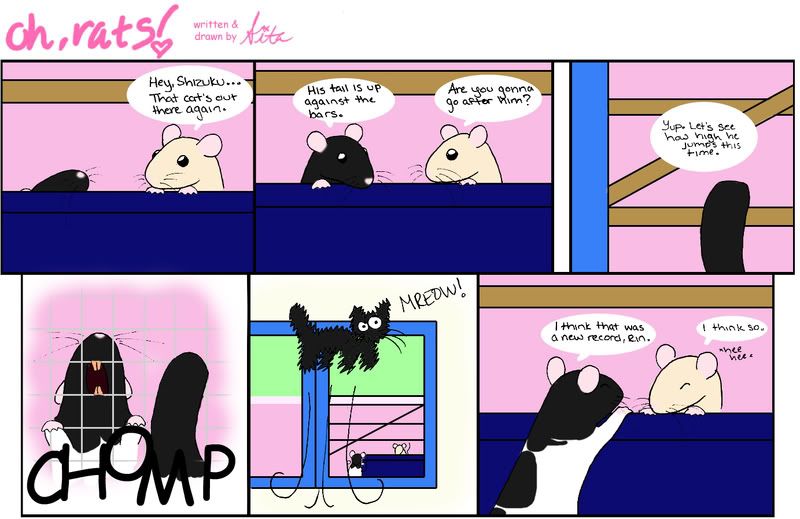 Kita, here! One of my hobbies is drawing, and today I decided to draw a comic featuring two of our rats, Lightning and Ukitake. (Based on Ukitake's love of treats, and Lightning's habit of playing dead.)