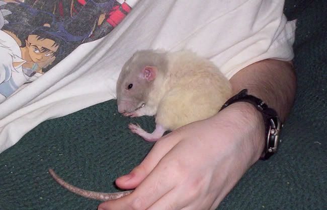 Three weeks ago, I checked my voicemail and I had two messages from a woman who had found a hairless white rat outside and had caught it; neighbors across the street had been evicted and had dumped him. She didn't know what to do with the rat and so had contacted a vet - the same vet we go to - and one of the receptionists gave her our number, knowing that if we couldn't provide the rat with a home, we would know of somewhere she could take it. I called the woman back and said we would take him - we arranged to get him, and it turned out she lives just a few blocks away from us. She found out, though, that another neighbor had already found the rat a home.